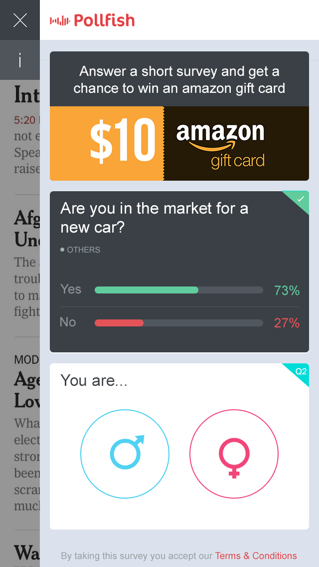 When a survey is available, the user is prompted by an in-app indicator to see if they would like to take part to a survey – and are rewarded for doing so by being entered into a drawing for a prize. Gifts are provided by the platform and are usually gift cards. Users can choose not to participate, or close the survey at anytime. In either case, everything will disappear from their screen, and they return to their in-app experience.