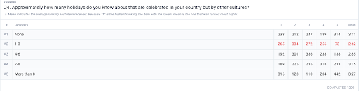 First, we asked our respondents, approximately how many holidays they know about that are celebrated in their country but by other cultures. We used a ranking question, in which each multiple-choice option requires a ranking of 1-5, with 1 signifying respondents’ top answer (or first choice) and 5 as the bottom.